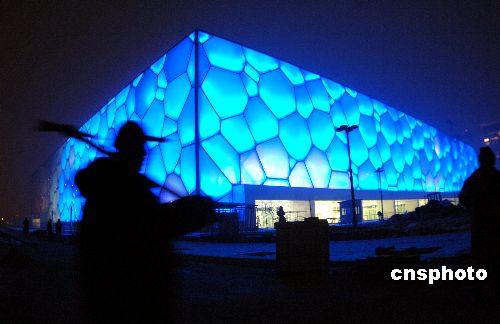 一月十八日,北京奧運游泳館——“水立方”開始調(diào)試造型燈光,“水立方”中每個氣泡被照射上藍色燈光,令人暢想奧運水世界。據(jù)悉,一月三十一日這里將舉行奧運測試賽,屆時“水立方”將被照射更多的彩色燈光。中新社發(fā) 廖攀 攝