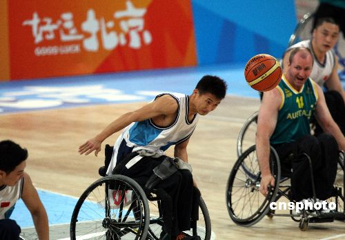 好運北京-2008國際輪椅籃球邀請賽,1月20日在北京奧運會主要賽場-國家體育館舉行。此次賽事的主旨是全面檢測北京殘奧會比賽的各個環(huán)節(jié),北京殘奧會的輪椅籃球賽事就在該體育館舉行。圖為世界勁旅澳大利亞隊(綠)與中國隊在男子比賽中。中新社發(fā) 任晨鳴 攝
