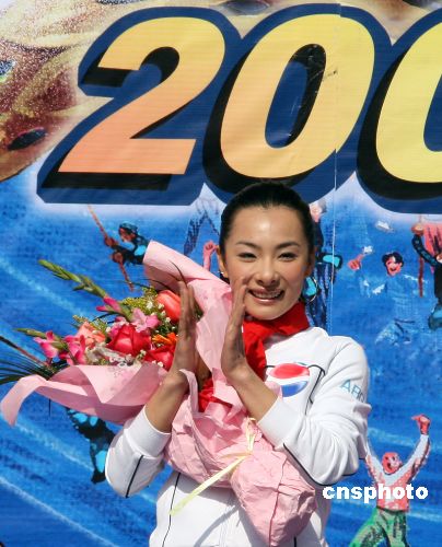 1月20日上午,中國體操世界冠軍劉璇在廣東惠州市帶領上萬市民歡呼齊跳“愛中國,中國隊加油!”集體舞。由惠州鵝城攝影學會主辦的“2008舞動大拇指,最愛中國年”攝影大賽同時開始,劉璇親自按動相機快門,主持攝影大賽開鏡儀式,并為惠州人民題寫新年祝詞。中新社發(fā) 宋秀杰 攝