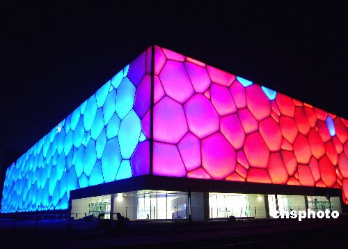 2008年1月23日晚,經(jīng)過清洗的“水立方”外膜透光度明顯增加,在藍色主燈光的照射下更加晶瑩剔透,其間閃爍變幻的紅、黃、綠燈光組合也更加鮮艷奪目,呈現(xiàn)出色彩斑斕如詩如畫的夢幻佳境。中新社發(fā) 玉龍 攝