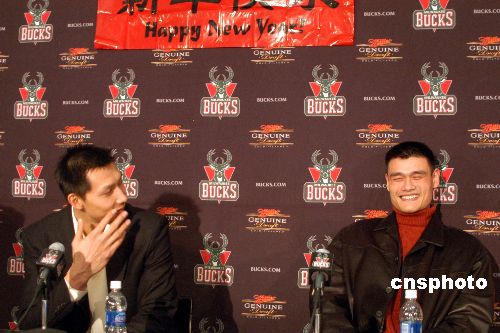 當(dāng)?shù)貢r間二月二日,姚明率領(lǐng)休斯敦火箭隊(duì)作客密爾沃基布拉德利球館,最終火箭隊(duì)以九十一比八十三險勝另一名中國球員易建聯(lián)所在的雄鹿隊(duì),獲得三連勝。賽后兩位“中國德比大戰(zhàn)”的主角在雄鹿隊(duì)特地安排的聯(lián)合記者會上談笑風(fēng)生,一同向中國球迷致以新春祝福。中新社發(fā) 李靜 攝
