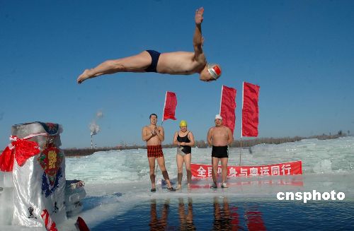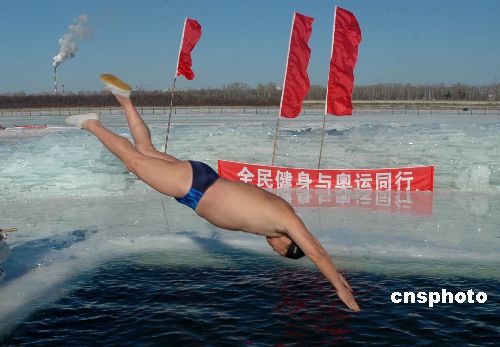 2月7日,黑龍江黑河市冬泳俱樂部與俄羅斯布拉戈維申斯克市冬泳俱樂部的30多名隊(duì)員,在黑河市中俄界江冒著零下30度的嚴(yán)寒,以冬泳方式歡度新春佳節(jié)。中新社發(fā) 邱齊龍 攝
