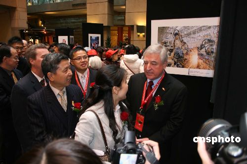 當(dāng)?shù)貢r間二月九日上午,巡回世界的“新北京、新奧運”北京奧運圖片展在加拿大溫哥華市中心開幕。圖為加拿大聯(lián)邦政府國際貿(mào)易部長艾民信(右)等政府官員參觀展覽。預(yù)計二十一天的展出將至少吸引三萬名觀眾,兩年后將主辦冬奧會的溫哥華正在掀起新的奧運高潮。中新社發(fā) 呂振亞 攝