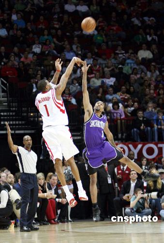 當(dāng)?shù)貢r(shí)間2月13日晚,火箭隊(duì)在大比分領(lǐng)先的情況下險(xiǎn)些被國王隊(duì)翻盤,最終以89比87取得八連勝,姚明25分14個(gè)籃板取得兩雙。中新社發(fā) 楊晉升 攝