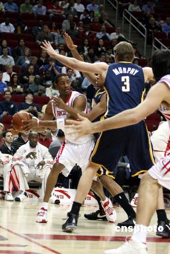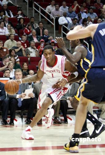 當?shù)貢r間3月5日晚,休斯敦火箭隊坐鎮(zhèn)主場,在缺少姚明的情況下,以117比99大勝印地安那步行者隊豪取16連勝,刷新了球隊41年歷史上的最長連勝紀錄。圖為火箭靈魂人物麥迪帶球突破。中新社發(fā) 楊晉升 攝