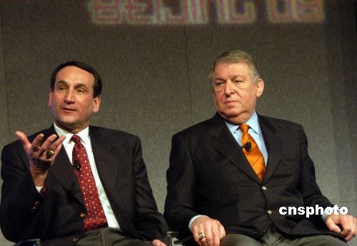 美國男籃主教練邁克·沙舍夫斯基(左)15日與美國籃球國家隊組建委員會主席科蘭杰洛(右)一同在芝加哥出席美國奧運(yùn)代表隊新聞峰會時稱:“美國人必須贏”的觀念已經(jīng)過時,此次奧運(yùn)奪金并非美國男籃的唯一目標(biāo)。 中新社發(fā) 李靜 攝
