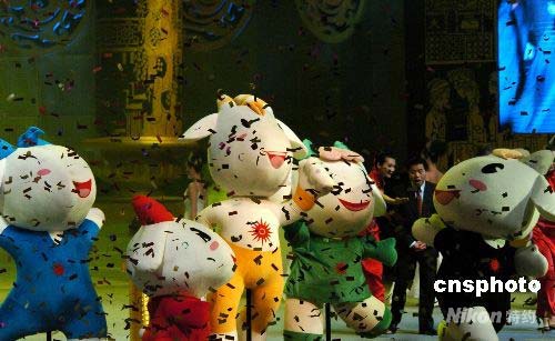 二十八日晚,廣州亞運(yùn)會(huì)吉祥物在白云國際會(huì)展中心發(fā)布。吉祥物取名“樂羊羊”,形象是運(yùn)動(dòng)時(shí)尚的五只羊,分別取名“阿祥”、“阿和”、“阿如”、“阿意”、“樂羊羊”,組成“祥和如意樂洋洋”,表達(dá)了廣州亞運(yùn)會(huì)將給亞洲人民帶來“吉祥、和諧、幸福、圓滿和快樂”的美好祝愿,同時(shí)也傳達(dá)該屆運(yùn)動(dòng)會(huì)“和諧、激情”的理念。中新社發(fā) 柯小軍 攝