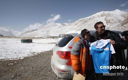 5月4日,由于身體原因,采訪北京奧運(yùn)火炬接力珠峰傳遞活動的德國記者約克,不得不撤離珠峰大本營新聞中心,退出此次采訪活動返回德國。圖為約克(右)撤離前接受北京奧組委工作人員贈送的簽名襯衫。 中新社發(fā) 盛佳鵬 攝