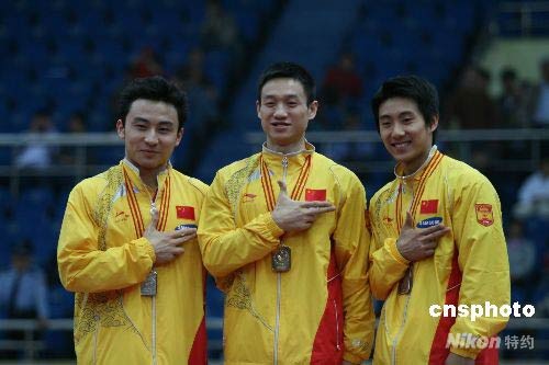 5月9日,2008年全國(guó)體操錦標(biāo)賽暨奧運(yùn)選拔賽男子全能決賽頒獎(jiǎng)儀式在天津體育中心舉行。楊威(中)以96.900分奪得男子全能金牌,馮喆、滕海濱分獲第二、第三名。中新社發(fā) 田齊 攝