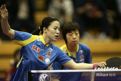 5月15日,在長春舉行的2008年國際乒聯(lián)巡回賽中國乒乓球公開賽進入第二天的比賽,在女子團體比賽中,王楠、張怡寧組合3比1戰(zhàn)勝日本福原愛、福岡春菜組合。中新社發(fā) 杜洋 攝