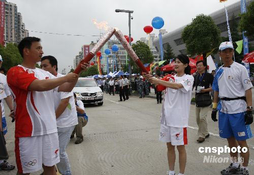 5月28日上午8時(shí),北京奧運(yùn)會(huì)火炬接力安徽的傳遞活動(dòng)在合肥拉開(kāi)帷幕。合肥籍世界跳水冠軍李娜擔(dān)任第一棒火炬手。圖為李娜將圣火傳遞給抗震勇士合肥市特警支隊(duì)的火炬手周世軍。中新社發(fā) 張婭子 攝