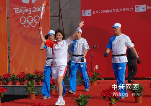 6月25日上午,奧運(yùn)火炬在山西運(yùn)城傳遞,8時15分山西第一棒火炬手,1984年洛杉磯奧運(yùn)會女子手球比賽團(tuán)體銅牌得主張衛(wèi)紅接過點(diǎn)燃的火炬開始傳遞。張雷杰 攝