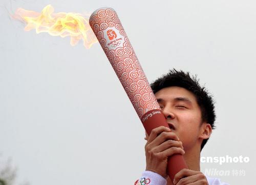 7月4日,奧運火炬在陜西西安傳遞,中國著名跳水運動員田亮作為西安第一棒火炬手在小雁塔下深情親吻奧運火炬。 中新社發(fā) 廖攀 攝