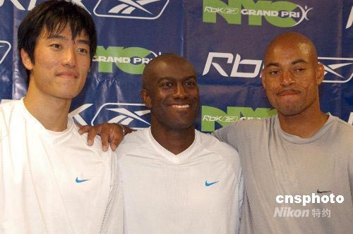 北京時間7月6日消息,在當(dāng)日進(jìn)行的美國田徑奧運(yùn)選拔賽110米欄爭奪中,劉翔最偉大的對手阿蘭-約翰遜小組賽傷勢復(fù)發(fā),未能完成比賽,七次世界冠軍沖擊北京奧運(yùn)的征程提前劃上句號。另一位勁敵,曾跑出12秒90的阿諾德也在1/4決賽搶跑被罰出,將缺席北京奧運(yùn)。資料圖為劉翔、阿蘭-約翰遜(中)、阿諾德(右)三人的合影。中新社發(fā) 劉小青 攝