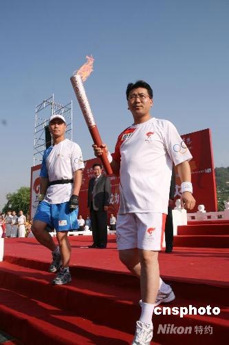 7月7日,北京奧運火炬在蘭州進行傳遞,第一棒火炬手是抗震救災英雄田宇。田宇是甘肅省隴南市徽縣嘉陵鎮(zhèn)政府武裝部部長,在“5·12”地震中,他帶領民兵搶救出8名受困群眾。 中新社發(fā) 周兆軍 攝