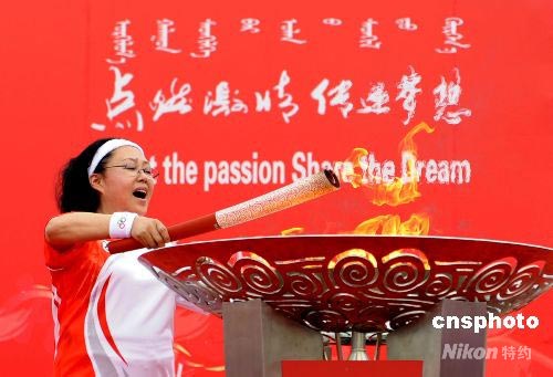 7月10日,奧運(yùn)火炬在內(nèi)蒙古赤峰傳遞。赤峰末棒奧運(yùn)火炬手中國著名演員斯琴高娃在玉龍廣場點燃圣火盆,奧運(yùn)火炬在內(nèi)蒙古進(jìn)行的傳遞結(jié)束。 中新社發(fā) 廖攀 攝