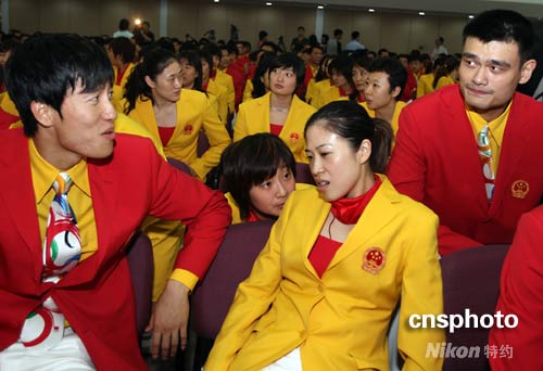 7月25日,參加北京奧運(yùn)會(huì)的中國(guó)體育代表團(tuán)在北京正式成立,兩位中國(guó)人氣最高的體育明星劉翔與姚明用上海話嘮家常。 中新社發(fā) 任晨鳴 攝