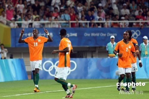 8月7日,北京奧運會上海足球分賽場男足預(yù)賽,作為首次參加奧運會足球比賽的科特迪瓦,在遭遇衛(wèi)冕冠軍阿根廷隊時毫不示弱,球員門以精湛的球技,征服現(xiàn)場球迷贏得掌聲。圖為科特迪瓦18號球員塞古·西塞(CISSE Sekou)進球后歡慶。中新社發(fā) 湯彥俊 攝