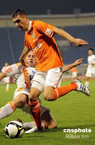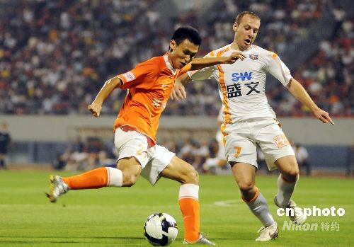 2008年9月7日,中國足球超級(jí)聯(lián)賽第9輪在山東濟(jì)南的一場(chǎng)比賽,主場(chǎng)作戰(zhàn)的山東魯能泰山隊(duì)以2比1戰(zhàn)勝青島盛文中能隊(duì)。中新社發(fā) 張侃 攝