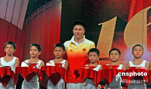 9月25日,湖南省人民政府授予李小鵬湖南功勛運(yùn)動員稱號,授予其教練陳雄功勛教練員稱號。李小鵬在當(dāng)晚舉行的《為奧運(yùn)湘軍喝彩》的頒獎晚會上第一次與自己的十六枚獎牌團(tuán)聚,其中的一枚獎牌曾為四川地震災(zāi)區(qū)籌集賑災(zāi)款而拍賣。中新社發(fā) 張家根 攝