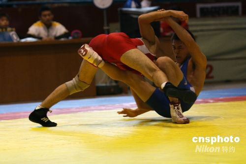 9月27日,運(yùn)動(dòng)員在進(jìn)行自由式摔跤比賽。當(dāng)日,全國男子自由式摔跤冠軍賽在河南許昌開賽,來自全國各地的340余名運(yùn)動(dòng)員在為期3天的比賽中展開角逐,比賽采用單敗淘汰全復(fù)活賽制,分別進(jìn)行資格賽、淘汰賽等。本次摔跤比賽由國家體育總局舉摔柔運(yùn)動(dòng)管理中心主辦,河南省體育局和許昌市體育局承辦。中新社發(fā) 牛書培 攝