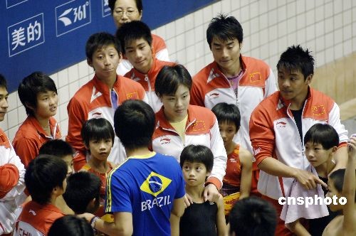 10月18日,奪得北京奧運(yùn)7金1銀3銅的中國跳水“夢之隊(duì)”成員郭晶晶、吳敏霞、何沖等在福州給小跳水運(yùn)動(dòng)員傳授技藝。當(dāng)日,2008全國跳水錦標(biāo)賽在福建省體育中心游泳跳水館開賽。中新社發(fā) 王東明 攝