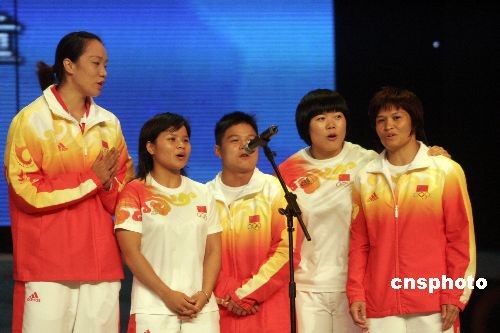 10月21日晚,贏得北京奧運(yùn)會(huì)拳擊、跆拳道、舉重、柔道、摔跤等項(xiàng)目的奧運(yùn)冠軍,包括張小平、鄒市明、陸永、陳?ài)葡肌⒋杭t、曹磊、王嬌、吳靜鈺、冼東妹、佟文、龍清泉、張湘祥、廖輝及前奧運(yùn)會(huì)女子跆拳道冠軍陳中等14位奧運(yùn)冠軍,參加“三亞城市精神評(píng)選暨奧運(yùn)冠軍三亞行活動(dòng)”晚會(huì),為觀眾演唱歌曲《真心英雄》。中新社發(fā) 尹恩彪 攝