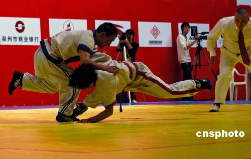 十月二十七日,第六屆全國農運會“中國式摔跤”在泉州僑鄉(xiāng)體育館正式開賽。此次比賽共有來自全國各地十個級別的八十名運動員參賽!爸袊剿印笔欠N類繁多的中國功夫當中最具中國特色的,運動員身穿短上衣、系腰帶、穿長褲,可以抱腿、絆腳、扯肩、扭腰等動作,只要把對方摔倒在地就能得分。中新社發(fā) 傅丹丹 攝