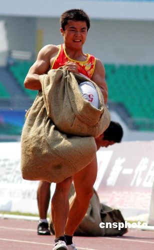 十月三十日,第六屆全國(guó)農(nóng)民運(yùn)動(dòng)會(huì)田徑比賽在福建泉州海峽體育中心拉開帷幕后,進(jìn)行了男子60米麻袋跳搬運(yùn)糧食賽跑,選手一開始要腳套在麻袋里用彈跳的方式“跳”到糧食袋前,然后把50公斤重的“糧食”裝進(jìn)麻袋,再搬到終點(diǎn),跳得快是關(guān)鍵。中新社發(fā) 傅丹丹 攝