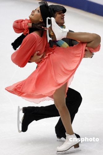 11月7日,2008中國杯世界花樣滑冰大獎賽在北京首都體育館進行第二天的爭奪,俄羅斯組合多姆尼娜、沙巴林在冰舞創(chuàng)編舞比賽后,以95.58的成績繼續(xù)排在參賽的十對選手之首。中新社發(fā) 盛佳鵬 攝
