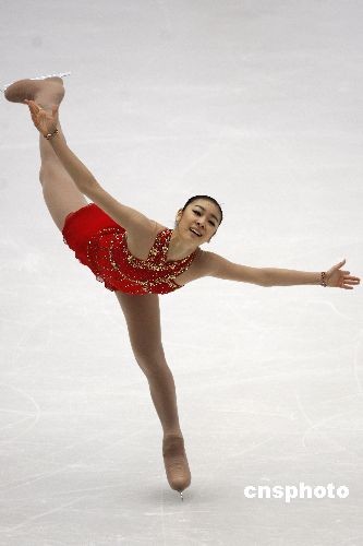 10月8日,2008中國杯世界花樣滑冰大獎賽在北京首都體育館進行第三天的爭奪,在女子單人滑比賽中,韓國選手金妍兒獲得冠軍。她的短節(jié)目得分為63.64分,今天的自由滑得分為128.11分,總分191.75分。金妍兒已經(jīng)連續(xù)兩年蟬聯(lián)世界花樣滑冰大獎賽總決賽的冠軍,今天再度中國站封后。圖為金妍兒在自由滑比賽中。中新社發(fā) 盛佳鵬 攝