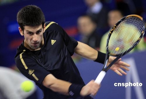11月9日,2008年上海網球大師杯在上海旗忠網球中心拉開戰(zhàn)幕。在當日進行的金組首場比賽中,塞爾維亞小天王德約科維奇以2比0戰(zhàn)勝阿根廷選手德爾波特羅,迎來自己在上海網球大師杯上的首場勝利。去年,德約科維奇首次亮相上海網球大師杯,小組賽3戰(zhàn)盡墨。中新社發(fā) 湯彥俊 攝
