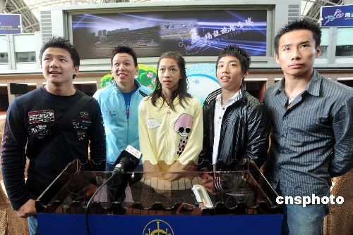 十一月二十日,北京奧運(yùn)金牌運(yùn)動(dòng)員代表團(tuán)再度訪港,并獲邀出席香港沙田馬場(chǎng)三十周年祝愿儀式。圖為奧運(yùn)體操金牌運(yùn)動(dòng)員(左起)陳一冰、黃旭、江鈺源、鄒凱及肖欽接受媒體訪問(wèn)。中新社發(fā) 鄧慶樂(lè) 攝