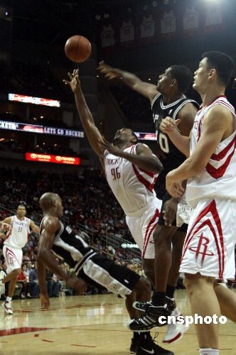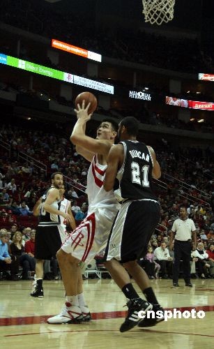 當(dāng)?shù)貢r間11月29日晚,火箭在主場以103-84大勝馬刺,成為西南區(qū)的領(lǐng)頭羊。火箭首發(fā)五虎得分都上雙,姚明打了27分鐘,拿下12分,但只搶1個籃板,蓋帽3次。中新社發(fā) 歐文 攝