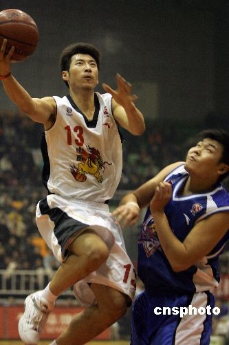 圖為山西中宇隊員于學(xué)林(白)突破上籃。