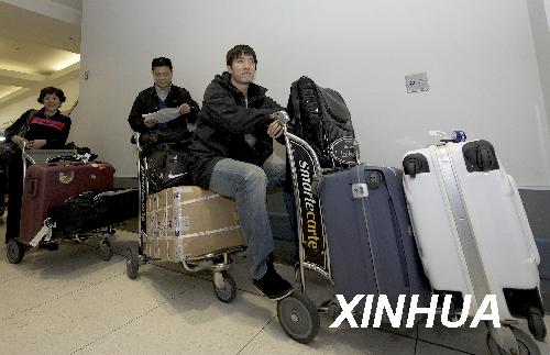劉翔(右)與母親吉粉花(左)、中國(guó)田徑隊(duì)總教練馮樹(shù)勇抵達(dá)美國(guó)洛杉磯國(guó)際機(jī)場(chǎng)