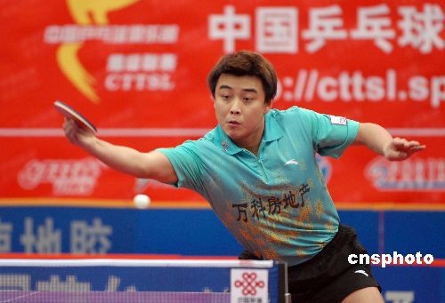 12月6日晚,2008年乒超聯(lián)賽第二階段比賽繼續(xù)進(jìn)行,在男團(tuán)一場保級大戰(zhàn),王皓雖拼勁全力,連勝錦州銀行兩員大將雷振華、徐輝,為球隊(duì)貢獻(xiàn)兩分,但困于球隊(duì)實(shí)力單薄,八一隊(duì)還是以2-3負(fù)于常規(guī)賽倒數(shù)第二錦州銀行。中新社發(fā) 谷進(jìn) 攝