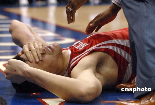 當(dāng)?shù)貢r間十二月十三日晚,NBA休斯敦火箭隊在洛杉磯客場挑戰(zhàn)洛杉磯快船隊,結(jié)果以八十二比九十五失利。第三節(jié)開始不久,姚明左眼被擊中后痛苦倒地,被迫暫時離場醫(yī)治,幾分鐘后姚明重新上場。但此后,火箭隊被逆轉(zhuǎn),最終失利。中新社發(fā) 張煒 攝