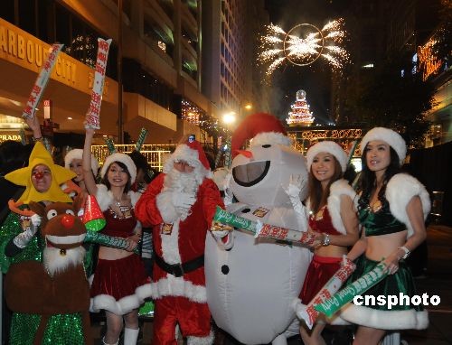 十二月二十四日晚(平安夜),逾十萬市民及游客齊聚香港尖沙咀鬧市,參加圣誕倒數(shù)街頭派對(duì),圣誕老人、圣誕女郎及雪人在場(chǎng)助興,節(jié)日氣氛濃厚。中新社發(fā) 蔡蔓莉 攝