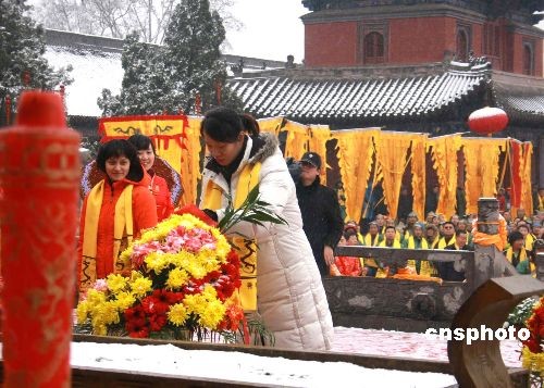 2月26日上午, 以“千年古廟會(huì),萬姓拜羲皇”為主題的2009年中國·淮陽羲皇故都朝祖會(huì)在羲皇故都——河南淮陽舉行。奧運(yùn)會(huì)冠軍及金牌獲得者高敏、陳中、郭文珺、陸春龍、張湘祥、陸永、鄒市明、殷劍、楊秀麗等,參加朝祖會(huì)。圖為陳中向人文始祖伏羲敬獻(xiàn)花籃。中新社發(fā) 王中舉 攝