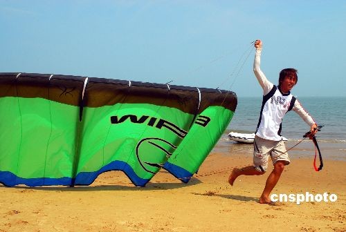 3月19日,為期兩天的“2009?诜弭唢L(fēng)箏沖浪邀請賽”在?谑形餍愫╅_幕。這是我國首次舉辦國際性風(fēng)箏沖浪大賽。比賽設(shè)公開級風(fēng)箏沖浪場地賽、風(fēng)箏沖浪自由花式賽、公開級帆板場地賽和特邀組帆板場地賽等多個(gè)項(xiàng)目。中新社發(fā) 善平 攝