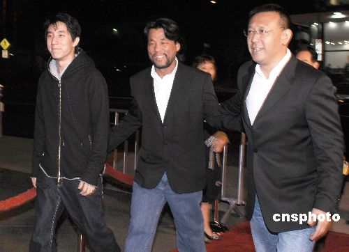 中美電影節(jié)十一月一日晚在好萊塢美國導演公會開幕,中國影星及導演姜文(右)和成龍之子房祖名(左)一起走紅地毯,出席《太陽照常升起》北美首映式。中新社發(fā) 賈國榮 攝