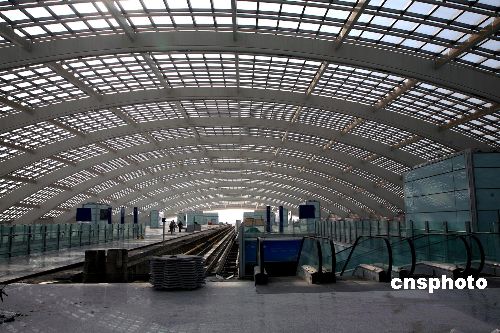 2007年11月6日,北京首都機(jī)場(chǎng)輕軌“3號(hào)航站樓站”接近尾聲,該車站位于首都機(jī)場(chǎng)3號(hào)航站樓前的交通中心內(nèi),旅客可通過扶梯直達(dá)3號(hào)航站樓。機(jī)場(chǎng)線全長(zhǎng)28.1公里,自西向東共設(shè)置了4座車站,起點(diǎn)站——“東直門站”與地鐵2號(hào)線和13號(hào)線互為換乘站,另外還包括三元橋站(與10號(hào)線互為換乘站)和“2號(hào)航站樓站”(位于2號(hào)航站樓與停車樓之間的綠地及現(xiàn)狀道路之下,旅客可經(jīng)通道直達(dá)2號(hào)航站樓)。該工程預(yù)計(jì)2008年4月建成,7月1日開始載客試運(yùn)營。屆時(shí),機(jī)場(chǎng)輕軌最高運(yùn)營速度100公里/小時(shí),東直門至首都機(jī)場(chǎng)運(yùn)行時(shí)間為16分鐘。中新社發(fā) 洪濤 攝