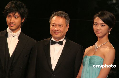十二月八日晚,第四十四屆金馬獎頒獎典禮在臺北小巨蛋舉行。圖為《色,戒》導(dǎo)演李安(中)攜主要演員湯唯(右)、王力宏出席頒獎典禮。中新社發(fā) 董會峰 攝