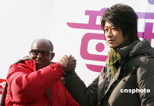 2008年1月2日下午,在北京林業(yè)大學(xué)體育場(chǎng)里,臺(tái)灣歌手游鴻明同坦桑尼亞奧運(yùn)英雄阿赫瓦里共同完成奧運(yùn)歌曲音樂(lè)電視《英雄》的場(chǎng)景拍攝。 中新社發(fā) 博芽影像 攝