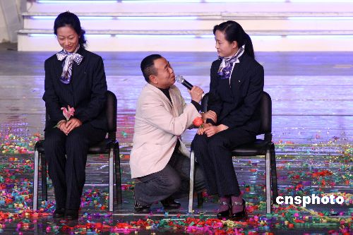 1月9日,2008年新春文藝晚會在河南藝術(shù)中心大劇院舉行,潘長江和在晚會現(xiàn)場找來的比自己小24歲的年輕媽媽以及一名20多歲的年輕媳婦作為搭檔共同表演小品《兩個(gè)對我恩重如山的女人》。中新社發(fā) 陳代述 攝