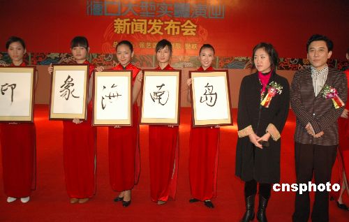 著名導(dǎo)演張藝謀執(zhí)導(dǎo)的?诖笮蛯嵕把莩雒Q一月二十一日在海南正式對外揭曉,“印象”系列再添新丁,《印象·海南島》成為張藝謀團(tuán)隊繼《印象·劉三姐》、《印象·麗江》、《印象·西湖》后的第四部作品。圖為張藝謀導(dǎo)演團(tuán)隊搭檔王潮歌(右二)和樊躍(右一)到?趨⒓用Q揭曉活動.中新社發(fā) 王辛莉 攝