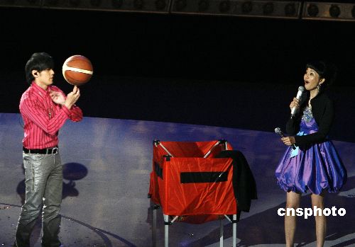 2008年1月21日,北京2008年奧運(yùn)會(huì)歌曲宣傳推廣啟動(dòng)晚會(huì)在北京奧林匹克籃球館舉行,歌手們傾情演出,用各自的歌聲為奧運(yùn)造勢(shì),周杰倫更是在現(xiàn)場(chǎng)進(jìn)行灌籃表演。這是竣工后的北京奧林匹克籃球館首次舉辦大型活動(dòng)。中新社發(fā) 魯谷 攝