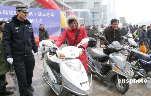 1月28日,連云港市公安局交巡警支隊(duì)和連云公安分局集中返還176輛被盜搶機(jī)動(dòng)車(chē)。去年以來(lái),連云港警方嚴(yán)厲查處各類(lèi)機(jī)動(dòng)車(chē)違法行為,加大盜搶車(chē)輛的犯罪行為的打擊力度。眾多失主在這批案值約100萬(wàn)元的被盜搶車(chē)輛中,現(xiàn)場(chǎng)將自己被盜搶車(chē)輛領(lǐng)到了手中。中新社發(fā) 王健民 攝