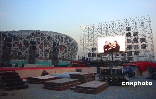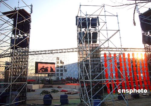 2月1日,施工人員正在國家體育場(“鳥巢”)和國家游泳中心(“水立方”)之間搭建“春節(jié)聯(lián)歡晚會”的演出設(shè)施。據(jù)悉,除夕夜奧運建設(shè)者們將可現(xiàn)場觀看到有關(guān)節(jié)目。 中新社發(fā) 玉龍 攝